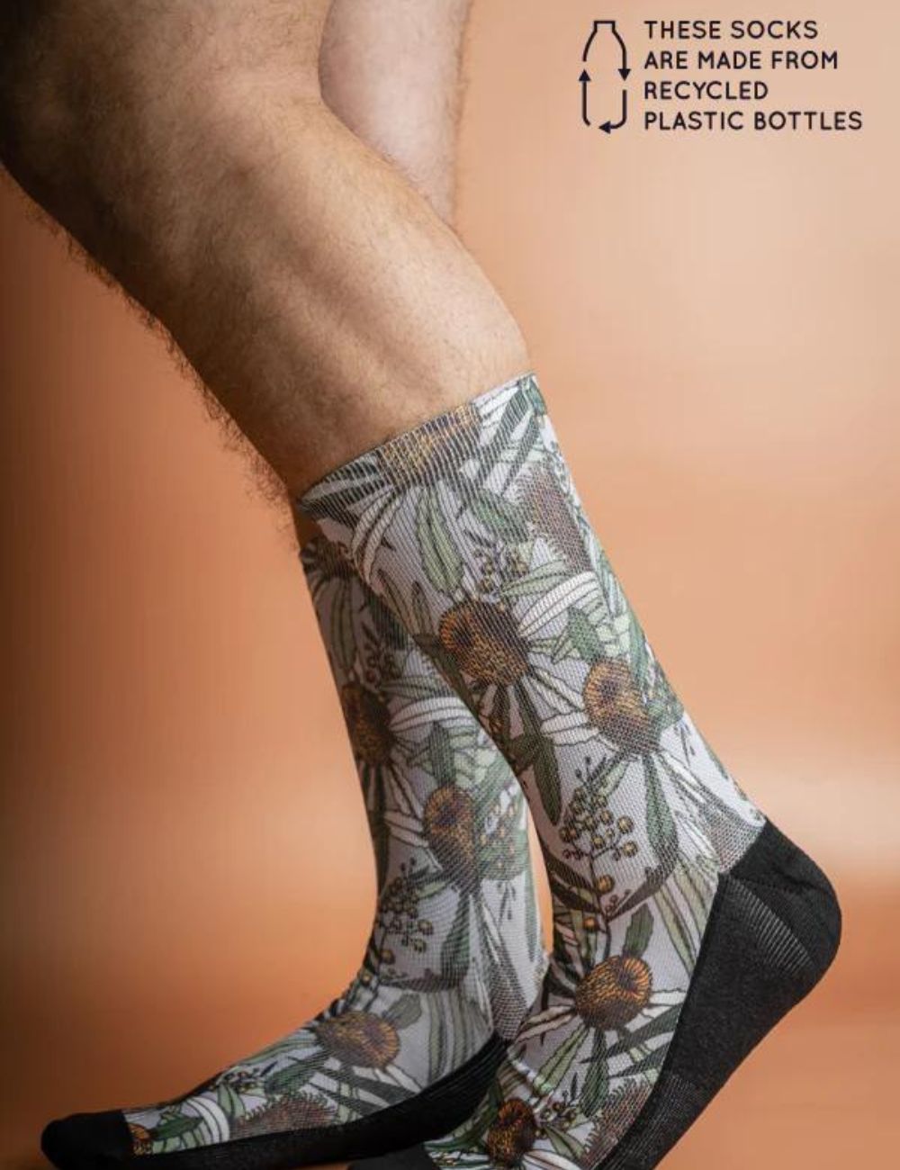 Featuring Banksia flora in a range of Grey, Green, White and a hint of Burnt Orange these Native Australian socks will have you looking and feeling your best.