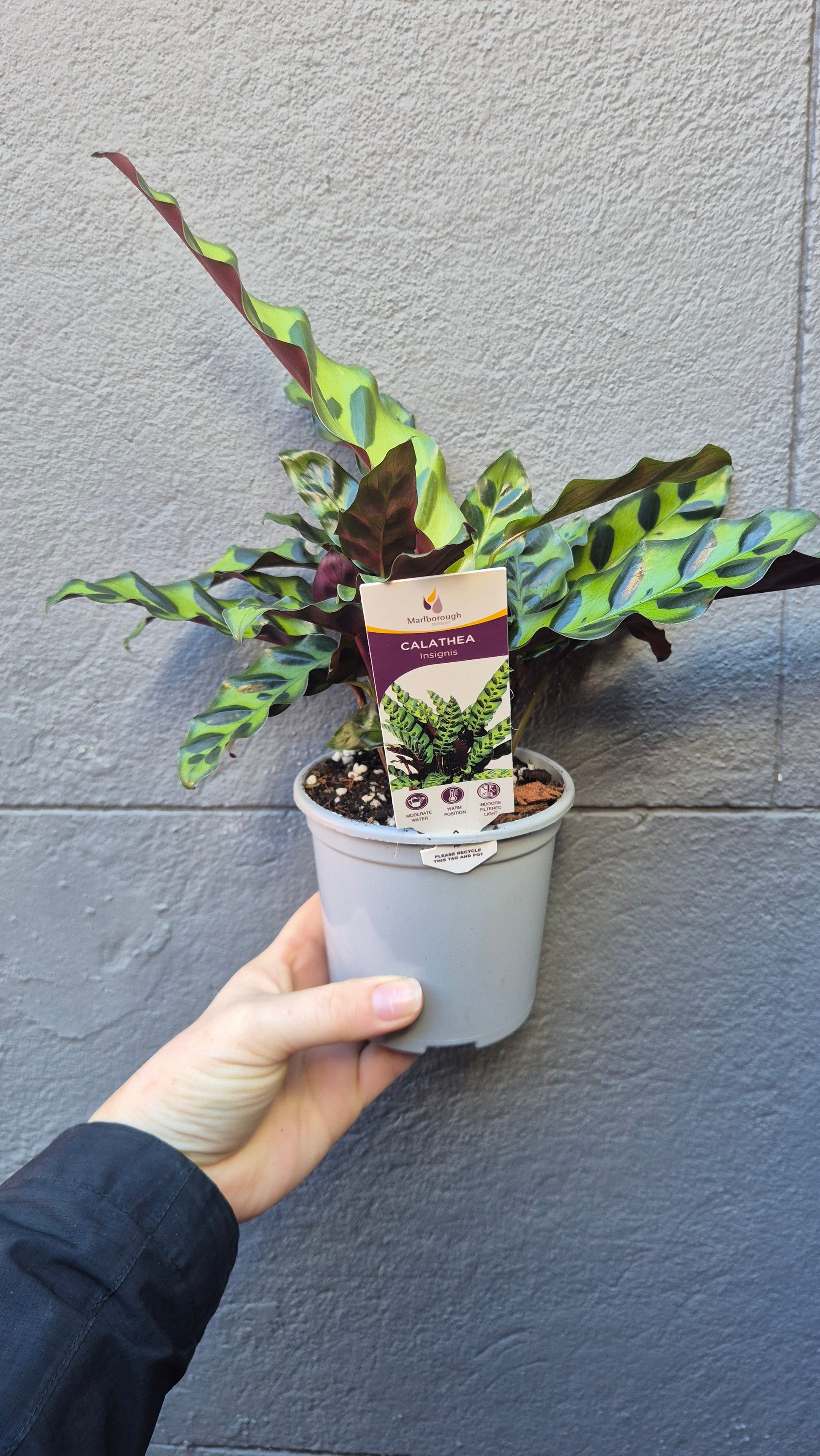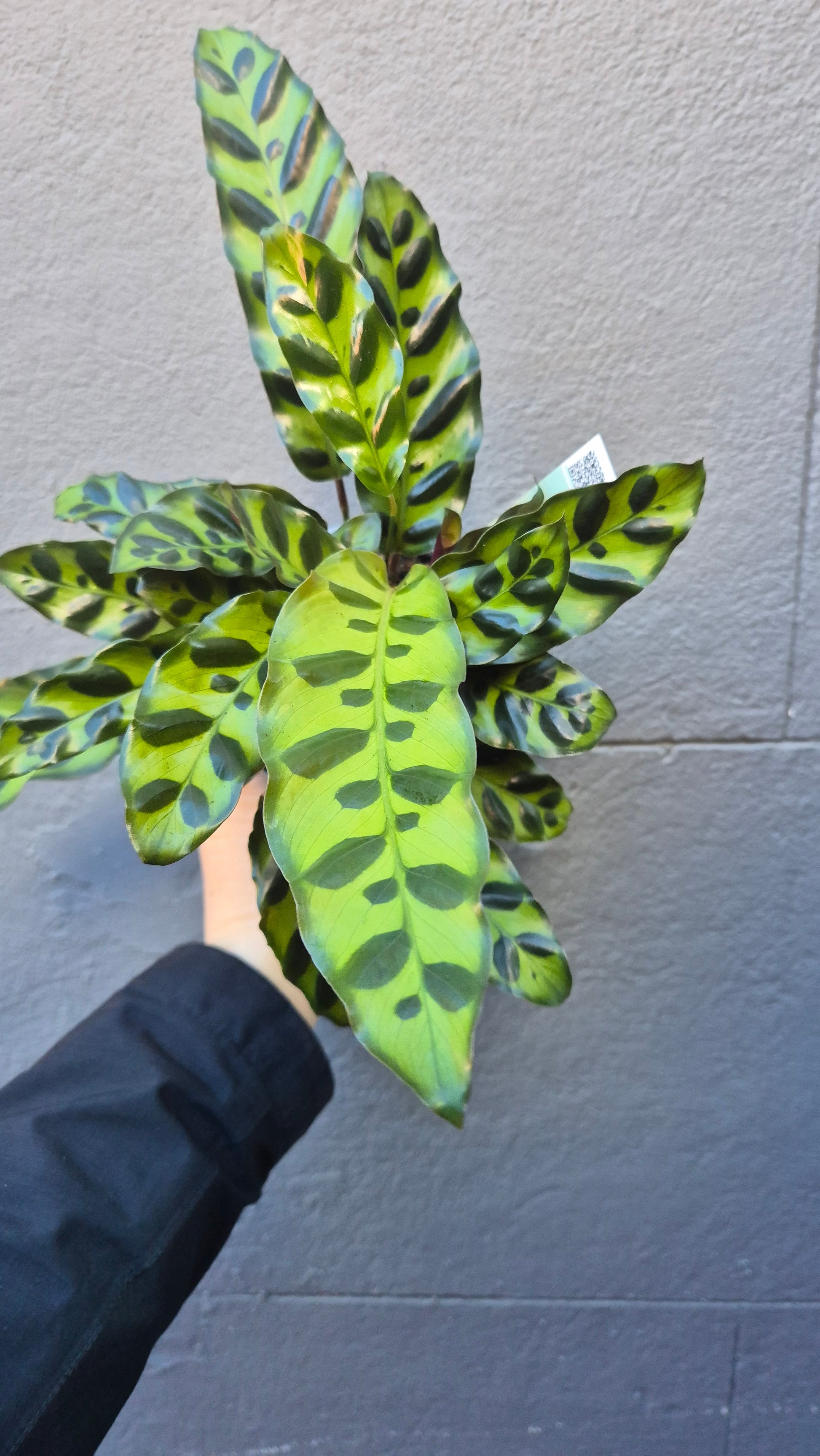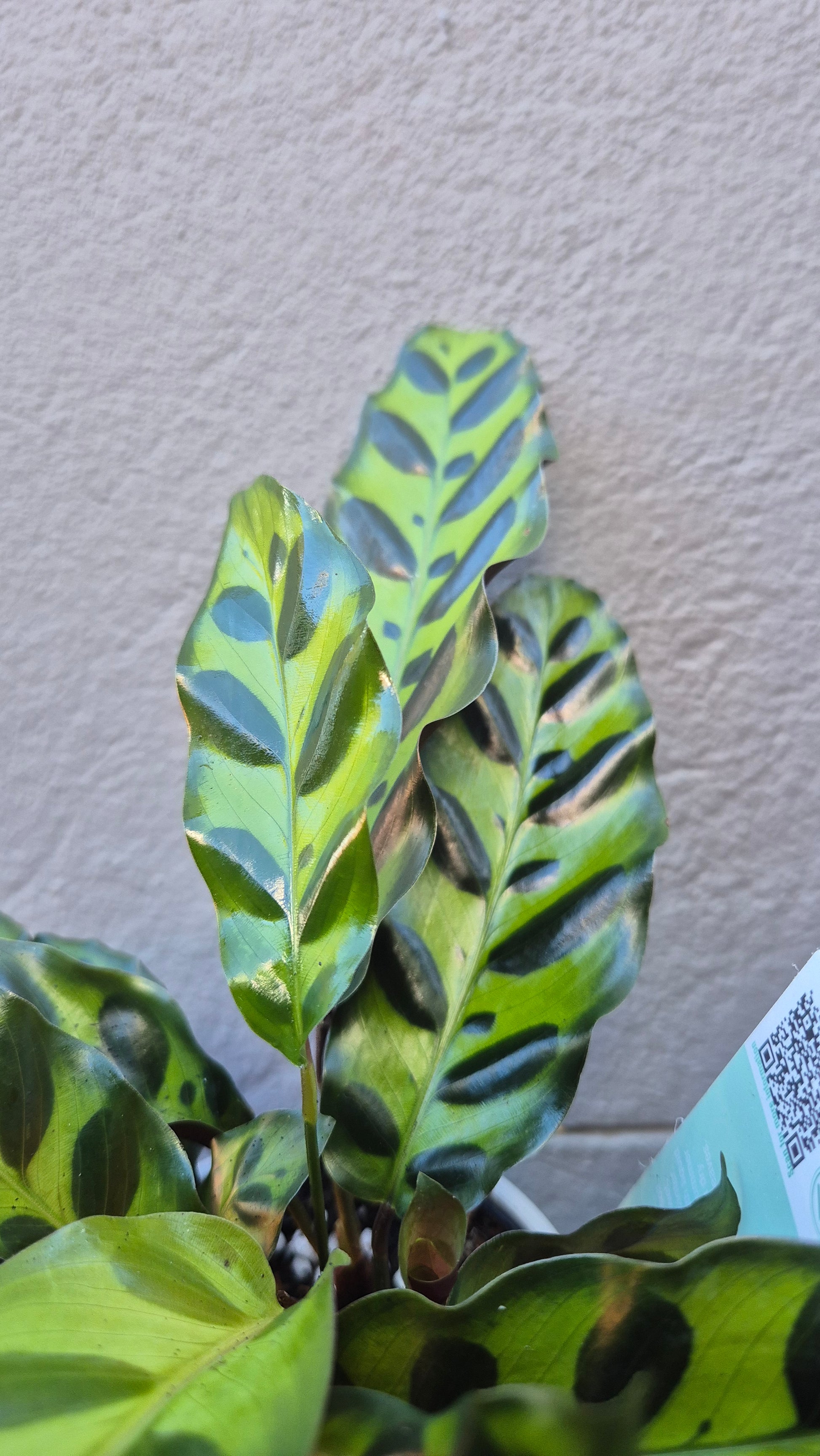 Features | Long, oblong leaves with unusual dark green spots. Striking purple underneath the leaves.