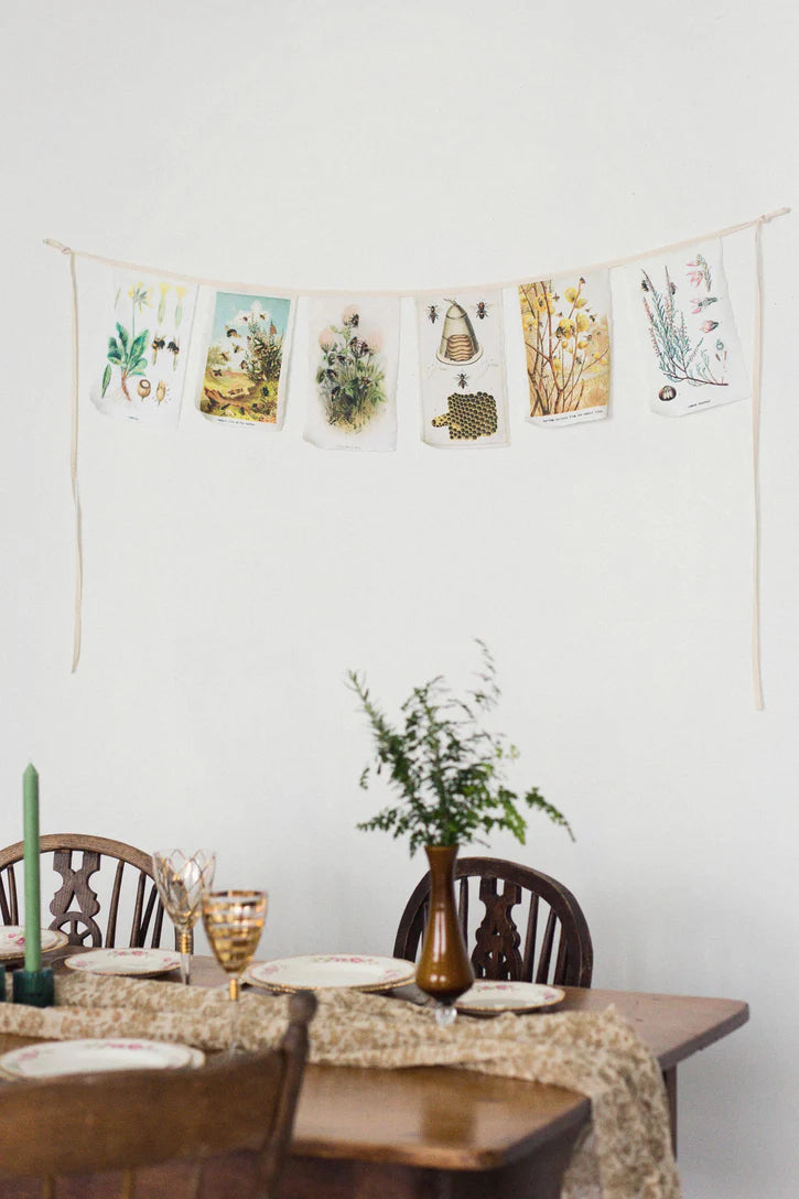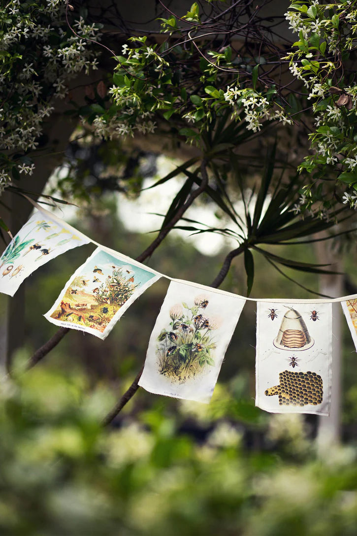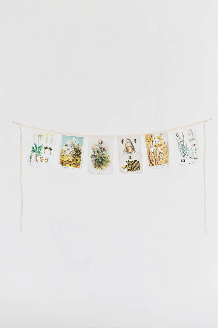 Celebrate the charm of our precious bees in your space with this exquisite bee garland/bunting. Inspired by botanical catalogues. Each delicate flag showcases beautifully bee illustrations sourced from the Biodiversity Heritage Library, celebrating the timeless artistry of nature.